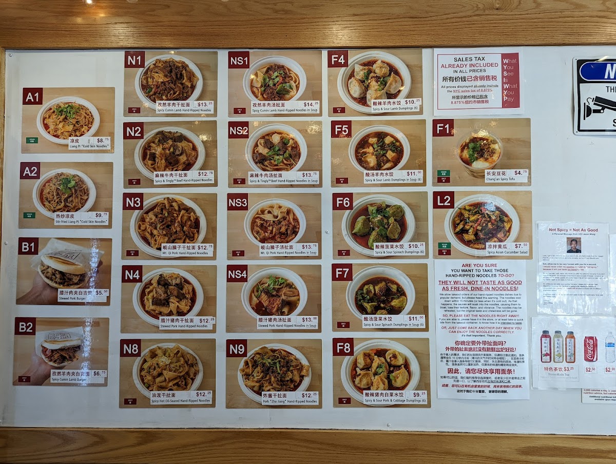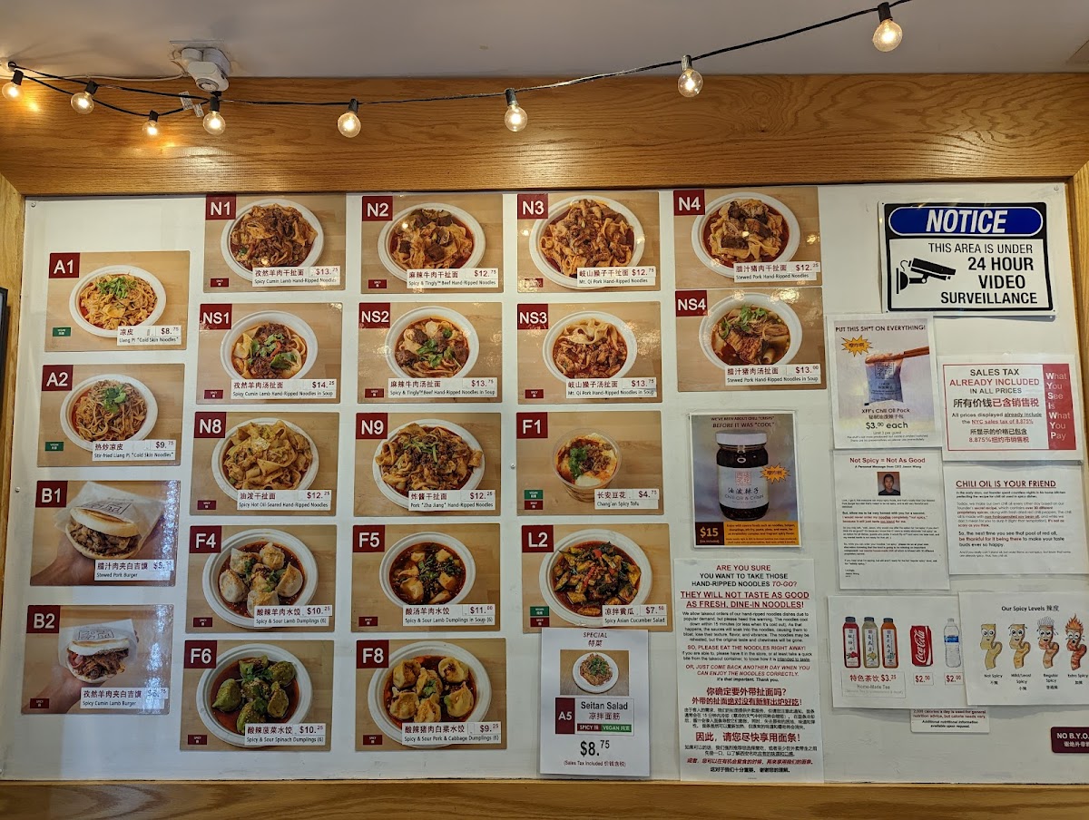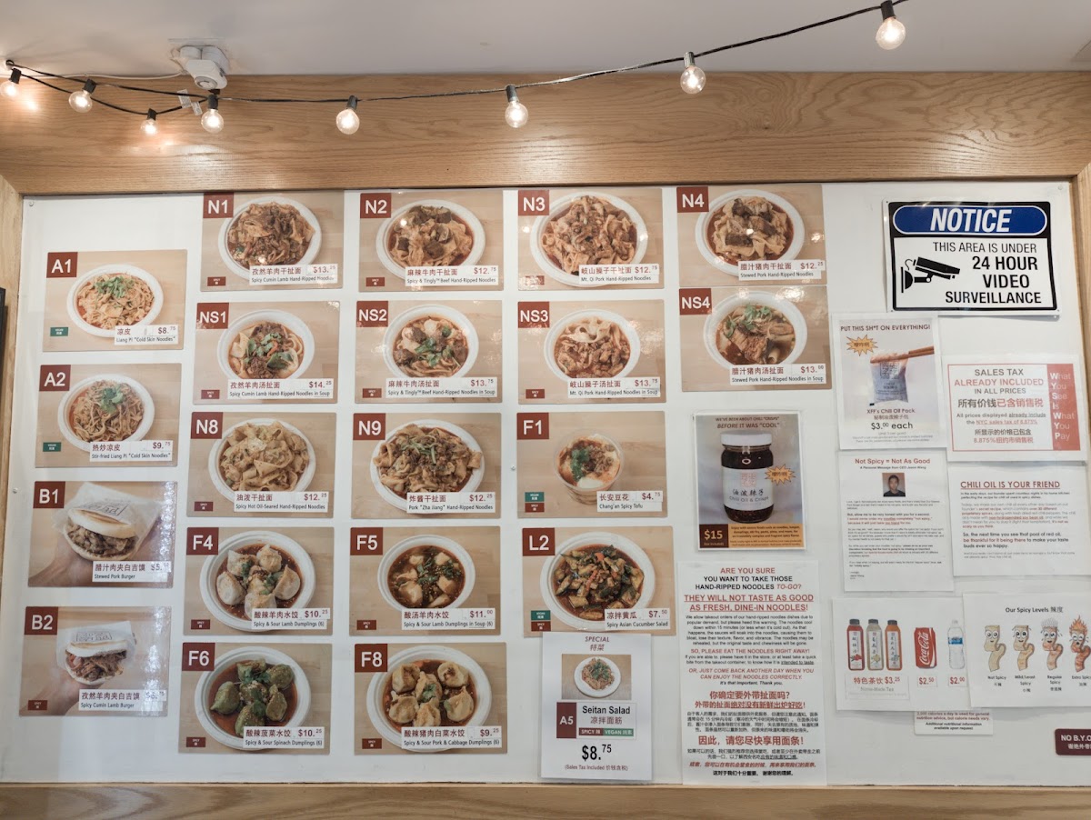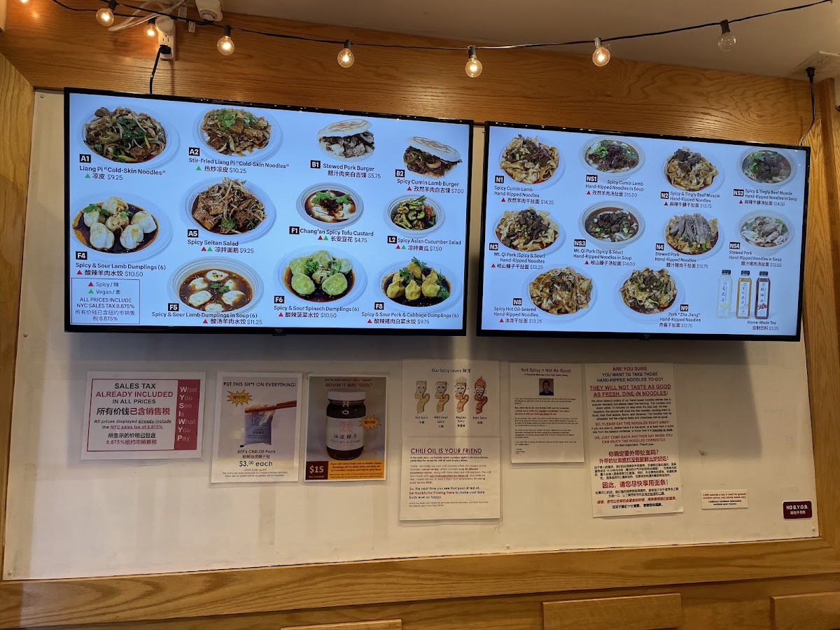 The dish that turned Anthony Bourdain into a fan. Thinly sliced lamb, spiced with cumin and chili powder, mixed with our chewy hand-pulled biang-biang noodles and topped with our soy-vinegar noodle sauce. An XFF original. Enjoyed spicy. [If packed separately: reheat protein by itself, then mix it with the noodles, the noodle sauce packet, and chili oil packet (if spicy) in the bowl with noodles and enjoy hot!]